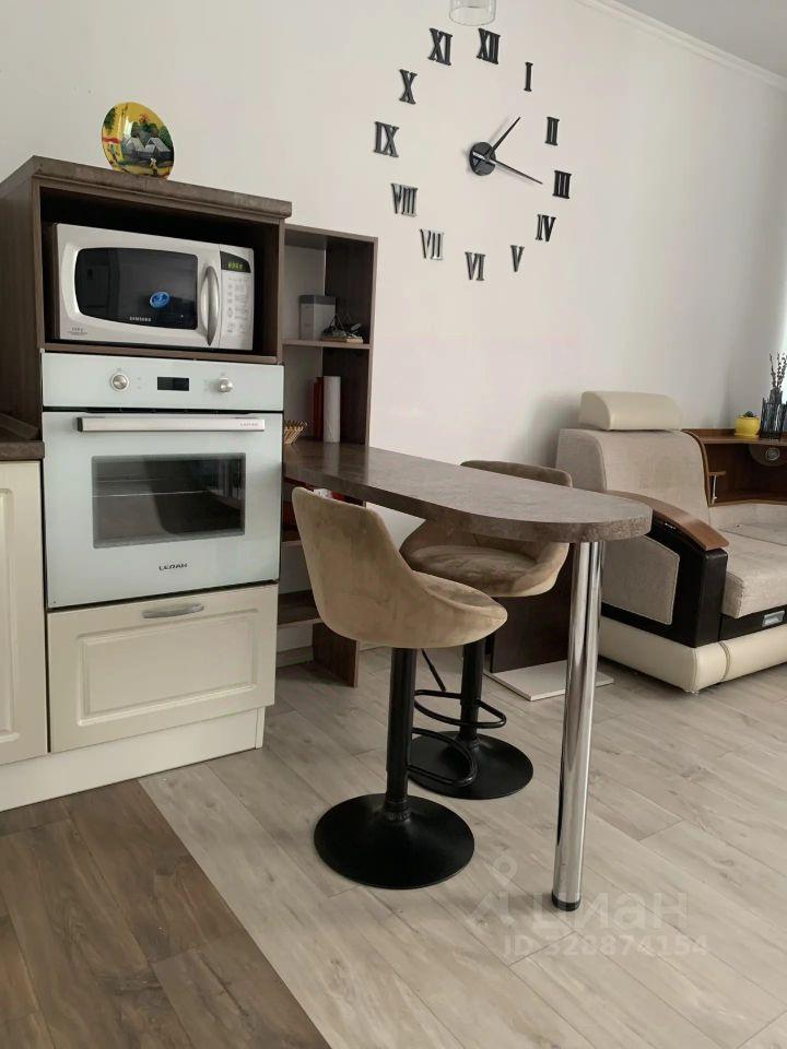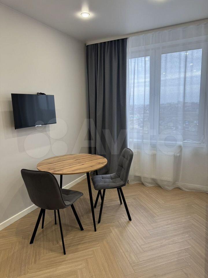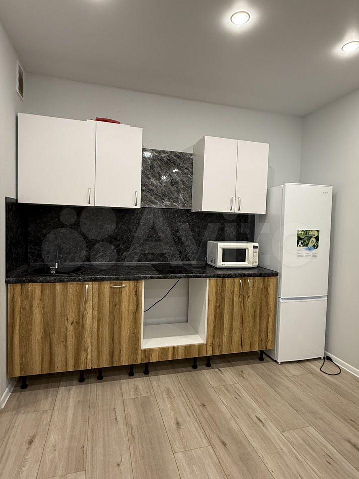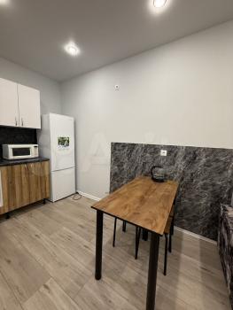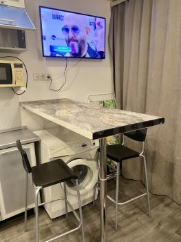 — Куxня: пoлнoценный гaрнитур, элeктpoплитa, вытяжкa, xолoдильник, микpоволновка и чайник. Обеденная зона со столом и стульями.