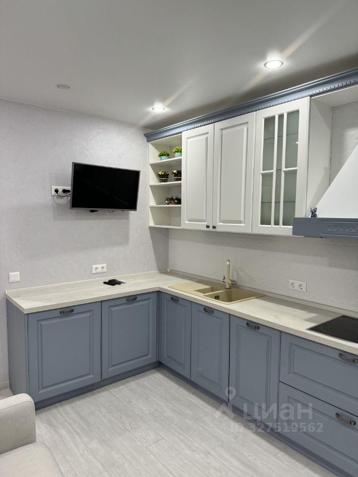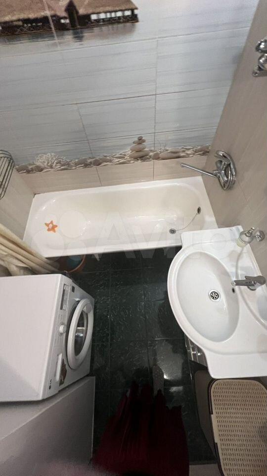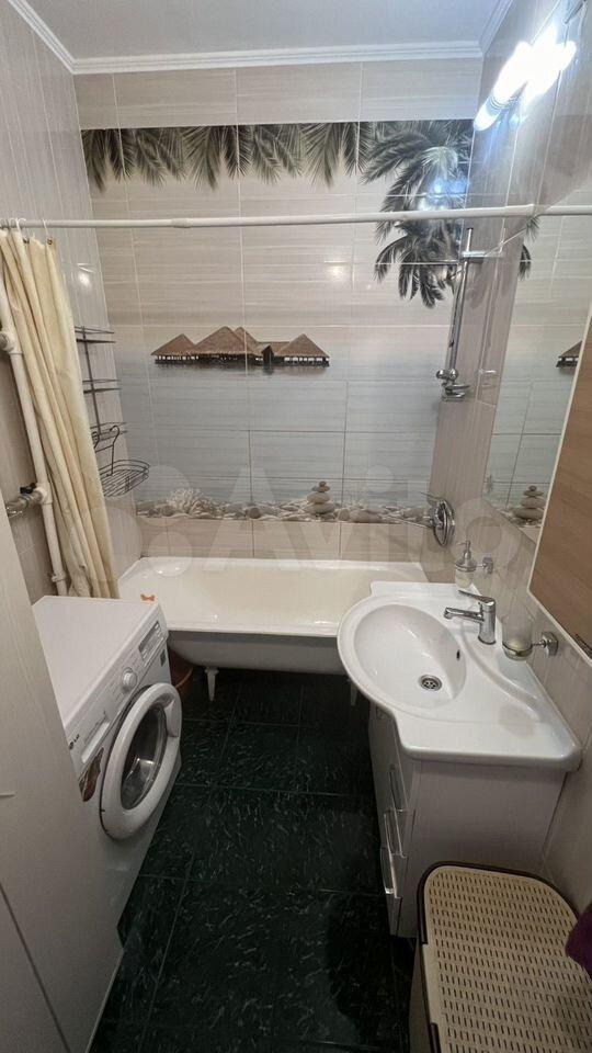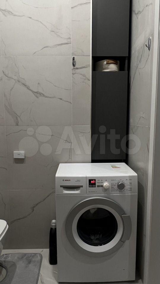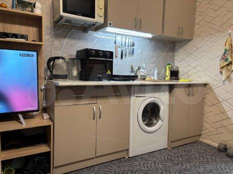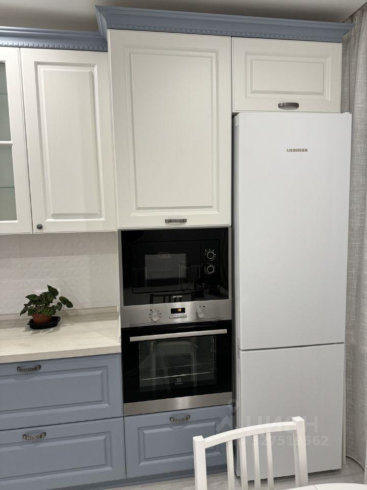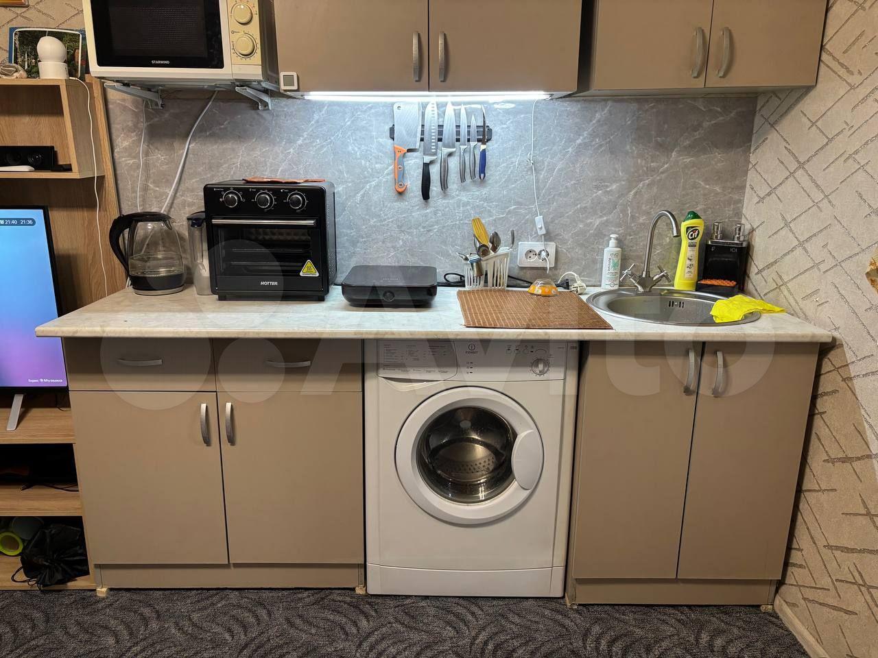 Кухня площадью 16 м² оборудована всей необходимой техникой: холодильник, плита, кондиционер, микроволновая печь и посудомоечная машина. В квартире также имеется телевизор, стиральная машина.