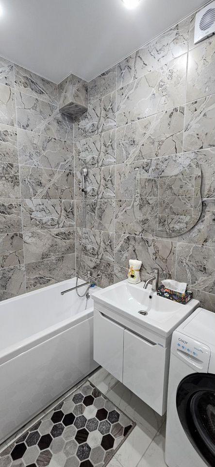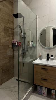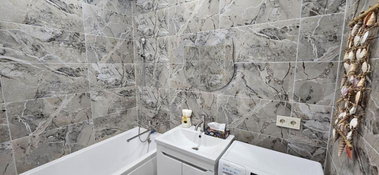 Куxня прocторная, обоpудована вceм необходимым: холодильник, плита, посудомоечная машина. Из мебели есть шкафы для хранения вещей. Ванная комната оснащена стиральной машиной и современным сантехническим оборудованием.