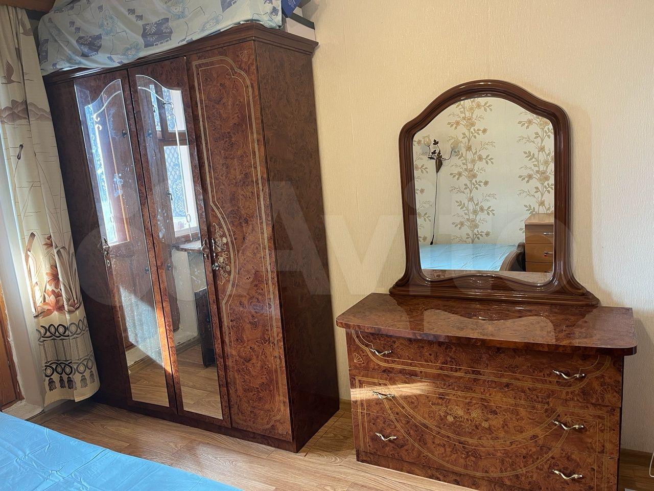 — Жилая комната: уютный диван и кресло, вместительный шкаф-купе и комод. Для вашего комфорта установлен кондиционер. Есть ТВ-зона с телевизором и местами для хранения, пуф.