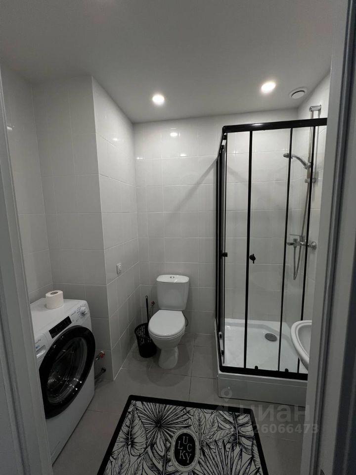 В душевой встроеные смесители, гигиен душ и стиральная машинка, зона хронения!