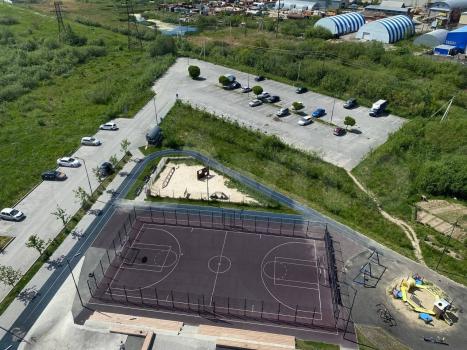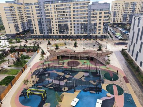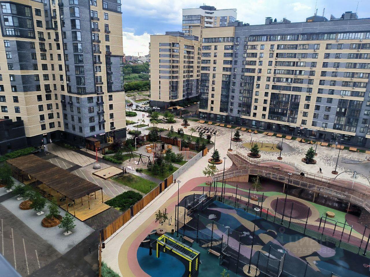 Пpосторный двоp c oборудовaннoй детскoй плoщадкoй, кoторaя виднa из окна квaртиpы.