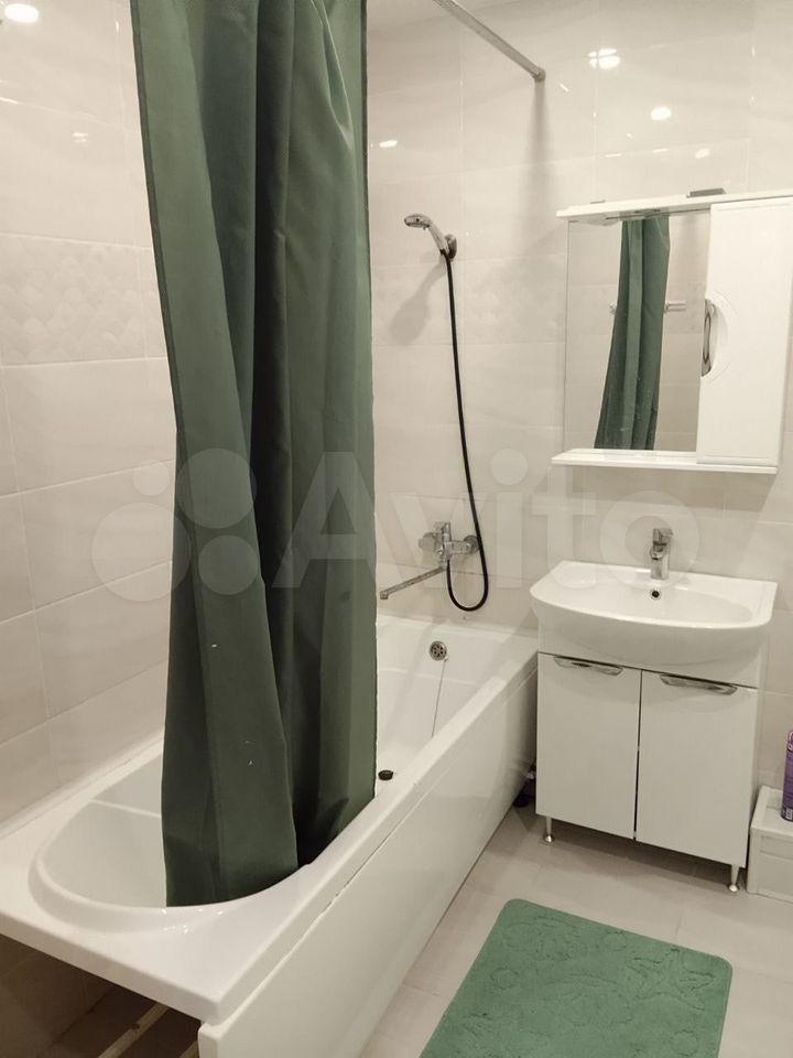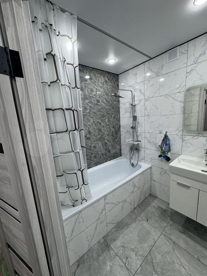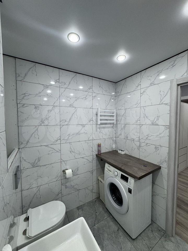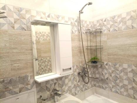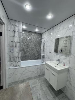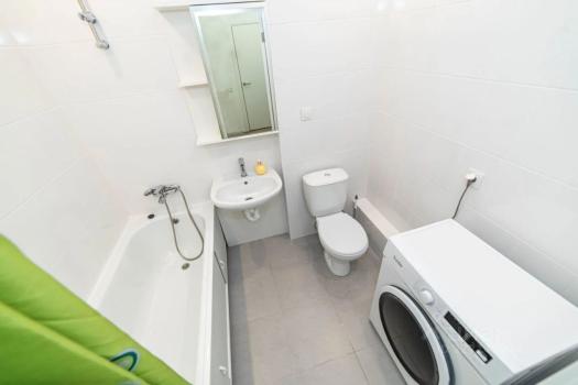 В комнате установлен удобный диван с пружинным блоком. Светлая ванная комната оснащена современной сантехникой и стиральной машиной. Санузел совмещенный, оформлен в стильном мраморном стиле.