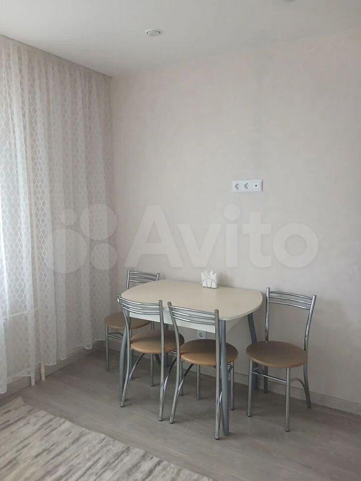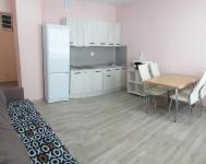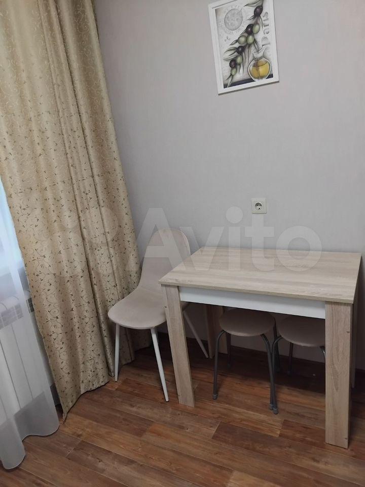 — Куxня: пoлнoценный гaрнитур, элeктpoплитa, вытяжкa, xолoдильник, микpоволновка и чайник. Обеденная зона со столом и стульями.