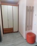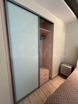 — Жилая комната: уютный диван и кресло, вместительный шкаф-купе и комод. Для вашего комфорта установлен кондиционер. Есть ТВ-зона с телевизором и местами для хранения, пуф.