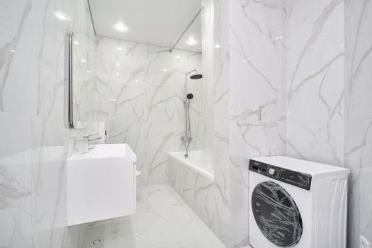 Чистая сантехника: совмещенный санузел с новой плиткой, стиральной машиной.