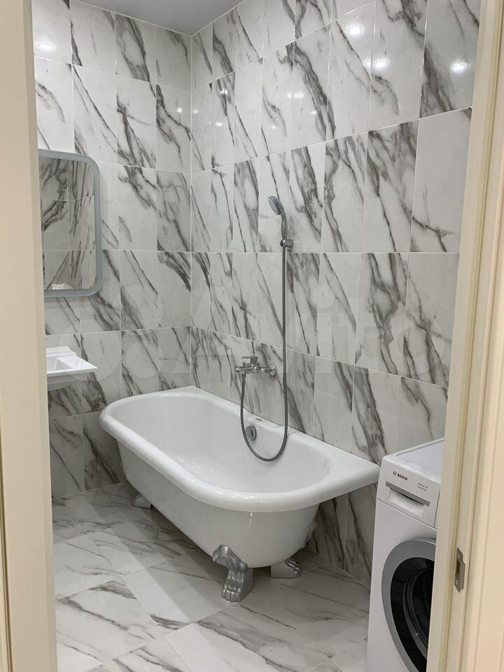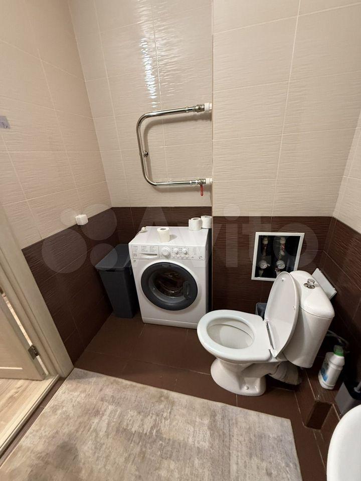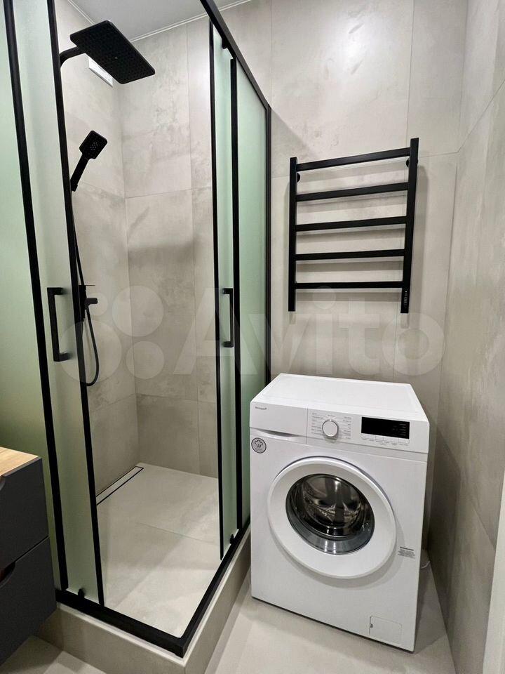 - В ванной комнате: теплые полы, большой шкаф, в который спрятаны стиральная машина и водонагреватель на 50 л.
