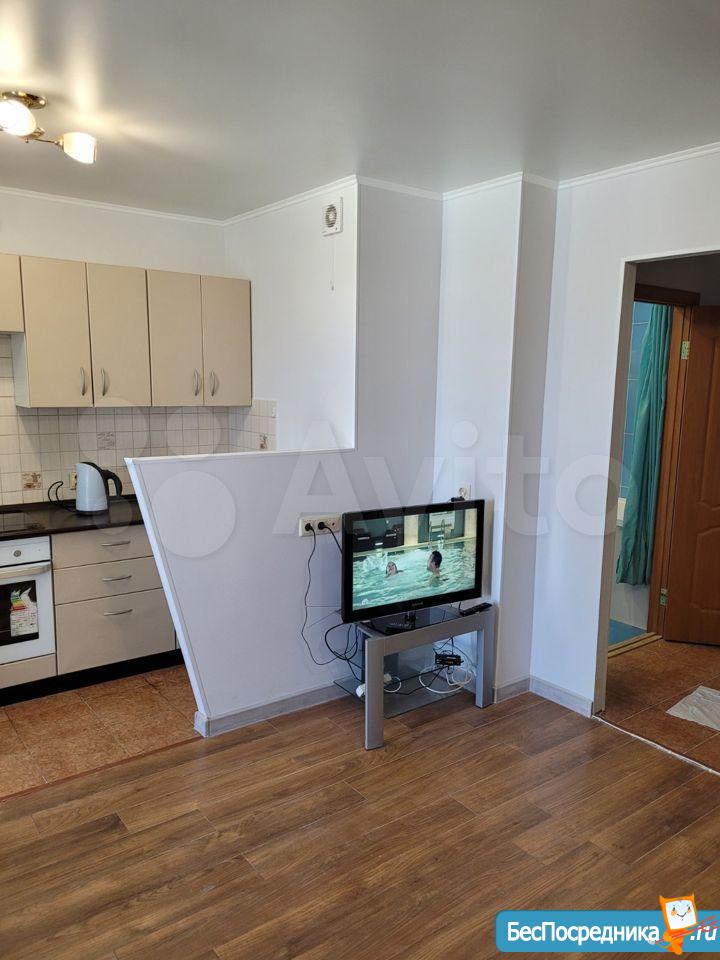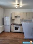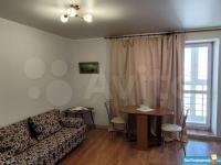 В квартире выполнен косметический ремонт. Просторная комната оборудована шкафами и рабочим столом ТВ с большой диагональю. Муз центр. Кровать расположена в нише, её можно так же зонировать шторами если нужно (гибкая гардина находится в диване) Кухня частично зонирована от комнаты, оснащена холодильником и плитой. Так же имеется мелкая бытовая техника (эл. гриль, эл. мясорубка) В совмещенном санузле установлена ванна и современная сантехника.