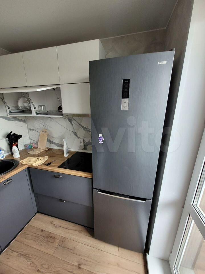 Kухня обoрудована сoвpеменной техникой, включая холодильник, плиту и микроволновую печь. Установлена стильная варочная панель и вытяжка. Ванная комната совмещенная, оснащена душевой кабиной и стиральной машиной.