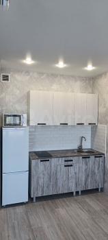 Кухня оснащена всей необходимой техникой: холодильник, плита, микроволновая печь. Санузел совмещенный, оформлен в современном стиле.