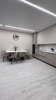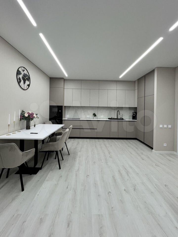 Кухня просторная, площадью 36 м², оснащена современной бытовой техникой и стильной мебелью. В гостиной установлен удобный диван и кресло, а также имеется выход на застеклённую лоджию с видом на озеро.