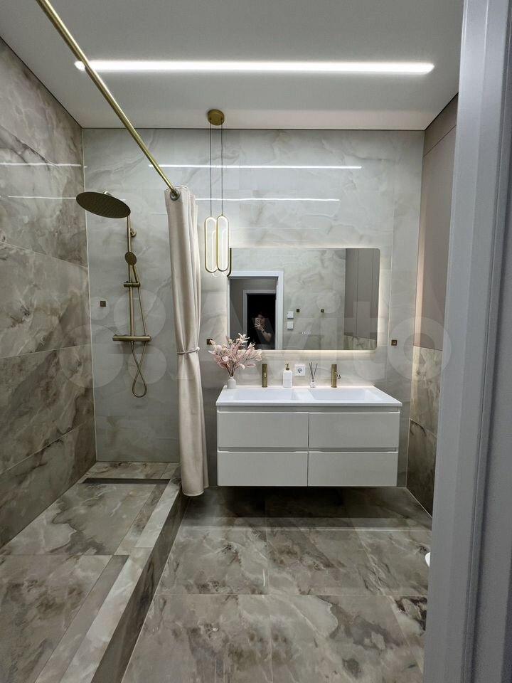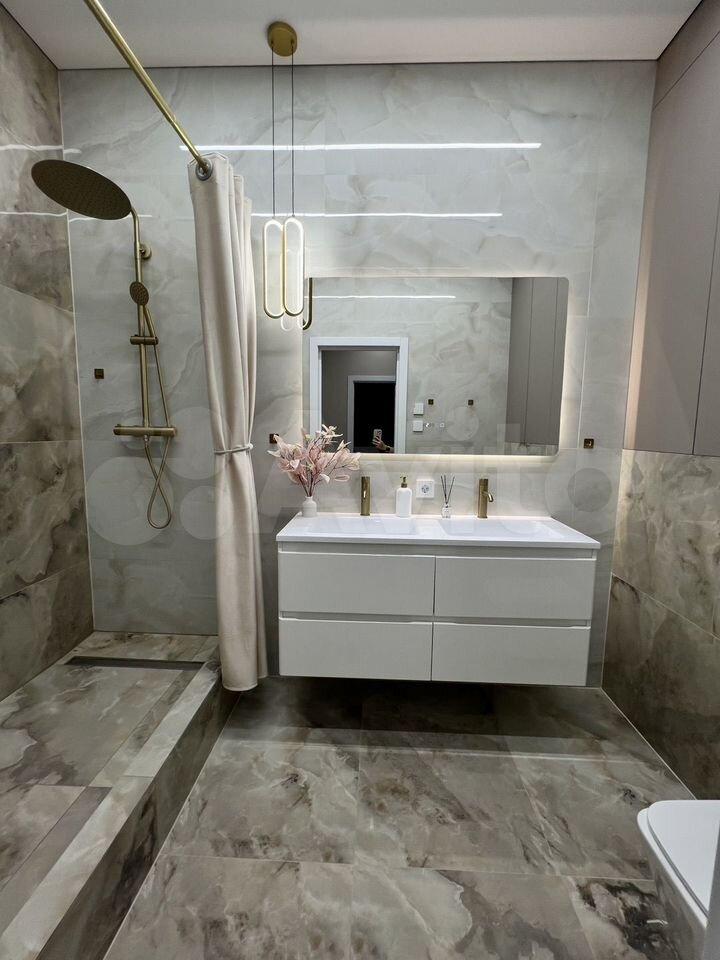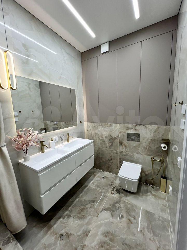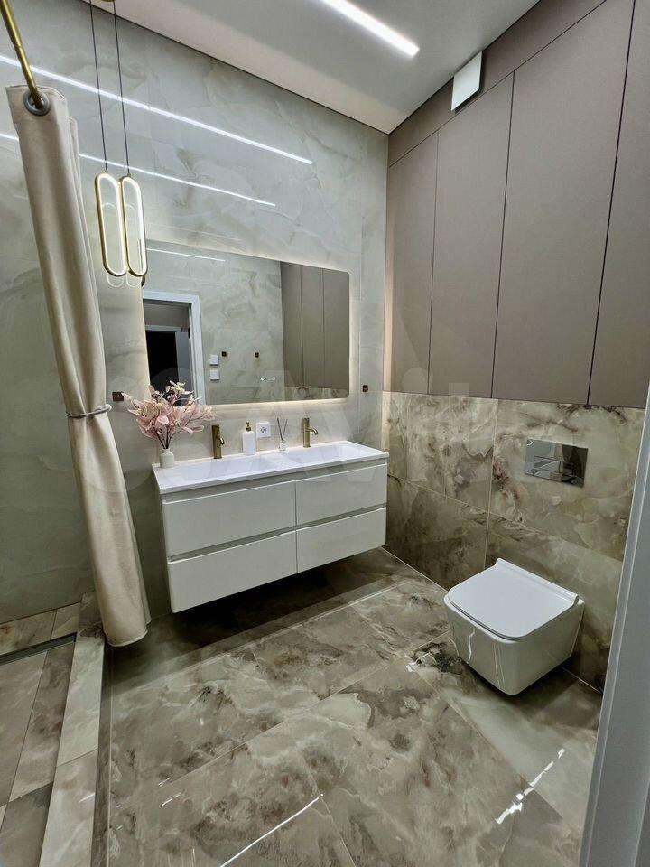 Санузел совмещённый, выполнен в современном стиле с качественной отделкой. В доме предусмотрены пассажирский и грузовой лифты, а также подземная парковка.
