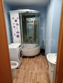 В санузле - душевая кабина с термостатическим смесителем, стиральная машина, раковина и тумба.