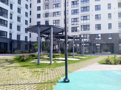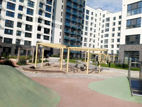 Закрытый благоустроенный двор: аккуратные дорожки, детская и спортивная площадки, зелёные насаждения и зоны отдыха.