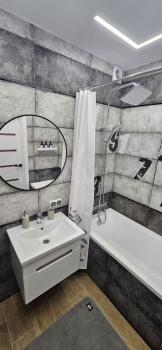 В квартире сделан дизайнерский ремонт, всё продумано до мелочей. Установлена современная мебель: кухня обставлена всем необходимым, в комнате — удобная мебель для отдыха. Установлена техника: холодильник, телевизор и стиральная машина. Санузел совмещённый, с современной ванной, что позволит расслабиться после трудового дня.