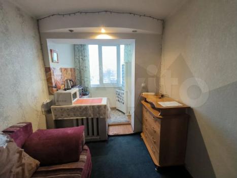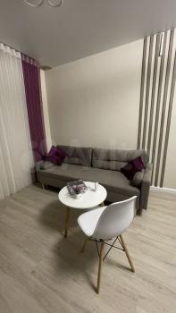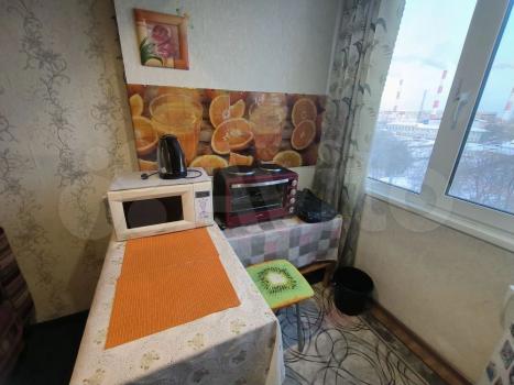 Квартира находится на 5 этаже 12-этажного здания. В студии выполнен косметический ремонт, установлены шкафы и необходимая мебель: диван, стол и стулья. Из техники имеется холодильник и стиральная машина.