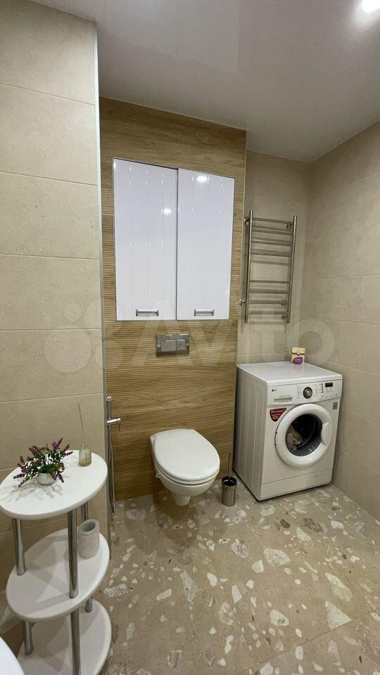 Ванная комната совмещенная, с современной сантехникой и стиральной машиной. Из окон открывается вид на городскую панораму, а также имеется застекленная лоджия, где можно наслаждаться вечерним видом.